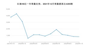 2022年11月,红旗H9销量为803辆,同比下降78.77%,环比下降3.6%。2021年11月-2022年11月份,红旗H9销量为21839辆,同比下降37.76%。