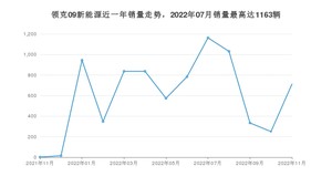 2022年11月,领克09新能源销量为712辆,同比增长71%,环比增长184.8%。2021年11月-2022年11月份,领克09新能源销量为7831辆,同比增长783%。
