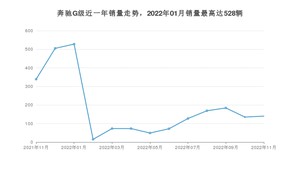 2022年11月,奔驰G级销量为140辆,同比下降58.7%,环比增长3.7%。2021年11月-2022年11月份,奔驰G级销量为2409辆,同比下降38.58%。
