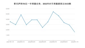 2022年11月,雷克萨斯RX销量为1567辆,同比下降55.66%,环比下降46.21%。2021年11月-2022年11月份,雷克萨斯RX销量为45989辆,同比下降18.54%。