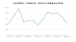 2022年11月,T-ROC探歌销量为4368辆,同比下降3.36%,环比下降34.6%。2021年11月-2022年11月份,T-ROC探歌销量为81479辆,同比下降5.05%。