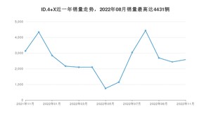 2022年11月,ID.4 X销量为2580辆,同比下降17.57%,环比增长6.17%。2021年11月-2022年11月份,ID.4 X销量为33700辆,同比增长110.97%。