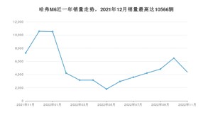 2022年11月,哈弗M6销量为4376辆,同比下降39.87%,环比下降32.67%。2021年11月-2022年11月份,哈弗M6销量为67159辆,同比下降61.13%。