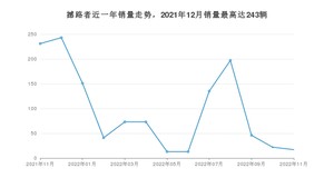 2022年11月,撼路者销量为17辆,同比下降92.64%,环比下降22.73%。2021年11月-2022年11月份,撼路者销量为1255辆,同比下降56.63%。