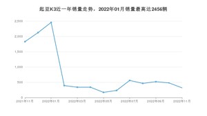 2022年11月,起亚K3销量为317辆,同比下降82.65%,环比下降33.82%。2021年11月-2022年11月份,起亚K3销量为10211辆,同比下降63.49%。