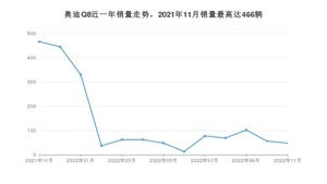 2022年11月,奥迪Q8销量为48辆,同比下降89.7%,环比下降14.29%。2021年11月-2022年11月份,奥迪Q8销量为1815辆,同比下降69.63%。