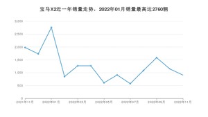 2022年11月,宝马X2销量为907辆,同比下降54.19%,环比下降20.92%。2021年11月-2022年11月份,宝马X2销量为16671辆,同比下降41.3%。