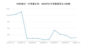 2022年11月,K5凯酷销量为170辆,同比下降85.97%,环比增长16.44%。2021年11月-2022年11月份,K5凯酷销量为5807辆,同比下降69.99%。