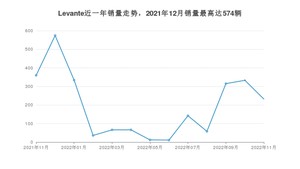 2022年11月,Levante销量为232辆,同比下降35.56%,环比下降30.33%。2021年11月-2022年11月份,Levante销量为2539辆,同比下降43.17%。