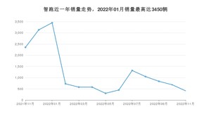 2022年11月,智跑销量为414辆,同比下降82.41%,环比下降39.3%。2021年11月-2022年11月份,智跑销量为15872辆,同比下降70.82%。