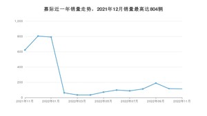 2022年11月,嘉际销量为113辆,同比下降81.83%,环比下降2.59%。2021年11月-2022年11月份,嘉际销量为3134辆,同比下降83.09%。