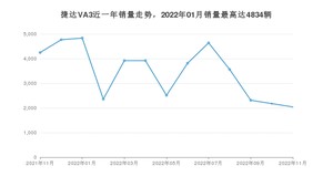 2022年11月,捷达VA3销量为2040辆,同比下降51.98%,环比下降6.25%。2021年11月-2022年11月份,捷达VA3销量为45105辆,同比下降19.14%。