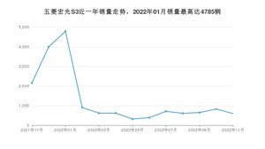2022年11月,五菱宏光S3销量为596辆,同比下降72.39%,环比下降27.93%。2021年11月-2022年11月份,五菱宏光S3销量为17182辆,同比下降54.75%。