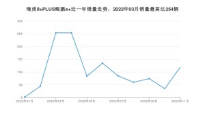 2022年11月,瑞虎8 PLUS鲲鹏e+销量为119辆,环比增长240%。2021年11月-2022年11月份,瑞虎8 PLUS鲲鹏e+销量为1146辆,
