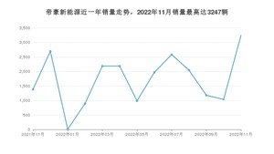 2022年11月,帝豪新能源销量为3247辆,同比增长134.95%,环比增长213.11%。2021年11月-2022年11月份,帝豪新能源销量为22410辆,同比增长719.38%。