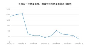 2022年11月,奕跑销量为155辆,同比下降89.01%,环比下降54.94%。2021年11月-2022年11月份,奕跑销量为8147辆,同比下降64.24%。