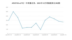 2022年11月,ARCFOX αT销量为264辆,同比下降12.87%,环比下降6.05%。2021年11月-2022年11月份,ARCFOX αT销量为3481辆,同比增长42.61%。