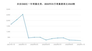 2022年11月,启辰D60销量为198辆,同比下降88.14%,环比下降15.02%。2021年11月-2022年11月份,启辰D60销量为9942辆,同比下降74.53%。
