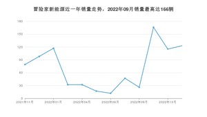 2022年11月,冒险家新能源销量为123辆,同比增长55.7%,环比增长6.96%。2021年11月-2022年11月份,冒险家新能源销量为864辆,同比增长408.24%。