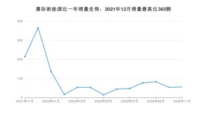 2022年11月,嘉际新能源销量为55辆,同比下降74.3%,环比增长3.77%。2021年11月-2022年11月份,嘉际新能源销量为1210辆,同比下降63.96%。