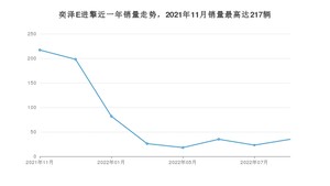 2022年11月,奕泽E进擎销量为35辆,同比下降83.87%,2021年11月-2022年11月份,奕泽E进擎销量为634辆,同比下降74.37%。