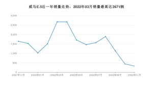 2022年11月,威马E.5销量为330辆,同比下降79.93%,环比下降26.01%。2021年11月-2022年11月份,威马E.5销量为19609辆,同比增长512.97%。
