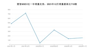 2022年11月,菱智M5EV销量为155辆,同比下降67.71%,环比增长14.81%。2021年11月-2022年11月份,菱智M5EV销量为1860辆,同比增长36.87%。