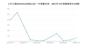 2022年11月,上汽大通MAXUS EUNIQ 5销量为63辆,同比下降84.13%,环比增长186.36%。2021年11月-2022年11月份,上汽大通MAXUS EUNIQ 5销量为1580辆,同比下降53.36%。