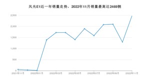 2022年11月,风光E1销量为2469辆,同比增长4%,环比增长91.99%。2021年11月-2022年11月份,风光E1销量为17712辆,同比增长1%。