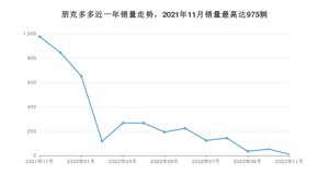 2022年11月,朋克多多销量为11辆,同比下降98.87%,环比下降79.25%。2021年11月-2022年11月份,朋克多多销量为3905辆,同比增长115.75%。