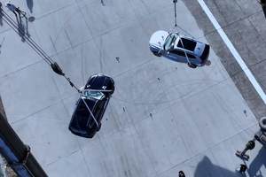 经过了“削顶之灾”后,两辆车进入到了高空坠落测试环节,主要检验车身结构与强度。只见两台A柱本来就已经受损的车子被起重机无情地吊到了离地面5.5米高的空中,然后保持在胎压相同的情况下,四轮朝下平摔。结果显示,沃尔沃XC60前桥断裂、宝马X3后桥断裂,虽然沃尔沃XC60在启动时间上比宝马X3快了一点,但它们都无法正常行驶,两辆车受损程度接近,这局打了个平手。