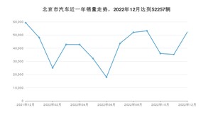 2022年12月,北京市汽车总销量为52257辆,同比下降11.88%,环比增长48.18%。2021年12月-2022年12月份,北京市总销量为540386辆,同比下降18.64%。在最近1年中,北京市销量在2021年12月达到最高,销量为59302辆。