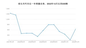 2022年12月,绥化市汽车总销量为650辆,同比下降57.71%,环比增长2%。2021年12月-2022年12月份,绥化市总销量为8274辆,同比下降39.6%。在最近1年中,绥化市销量在2021年12月达到最高,销量为1537辆。