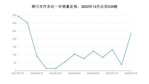 2022年12月,铜川市汽车总销量为235辆,同比下降31.88%,环比增长535.14%。2021年12月-2022年12月份,铜川市总销量为1617辆,同比下降70.92%。在最近1年中,铜川市销量在2021年12月达到最高,销量为345辆。