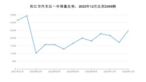 2022年12月,阳江市汽车总销量为2498辆,同比下降20.75%,环比增长45.66%。2021年12月-2022年12月份,阳江市总销量为26196辆,同比下降19.65%。在最近1年中,阳江市销量在2022年01月达到最高,销量为3441辆。