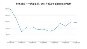 2022年12月,秦PLUS销量为14433辆,同比下降41.6%,环比下降3.15%。2021年12月-2022年12月份,秦PLUS销量为161527辆,同比增长30.74%。