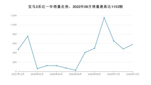 2022年12月,宝马2系销量为581辆,同比增长23.09%,环比增长20.54%。2021年12月-2022年12月份,宝马2系销量为5415辆,同比下降43%。
