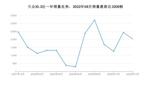 2022年12月,大众ID.3销量为2028辆,同比下降17.66%,环比下降17.09%。2021年12月-2022年12月份,大众ID.3销量为21434辆,同比增长312.19%。