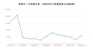 2022年12月,博越销量为6480辆,同比下降61.35%,环比增长128.17%。2021年12月-2022年12月份,博越销量为91788辆,同比下降50.62%。