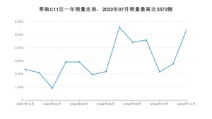 2022年12月,零跑C11销量为5368辆,同比增长129.6%,环比增长94.78%。2021年12月-2022年12月份,零跑C11销量为40180辆,同比增长976.35%。