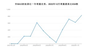 2022年12月,宋MAX新能源销量为834辆,同比增长27%,环比增长34.08%。2021年12月-2022年12月份,宋MAX新能源销量为4251辆,同比增长198.95%。