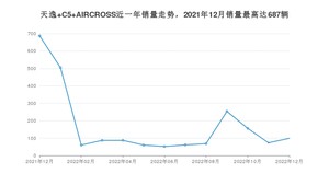2022年12月,天逸 C5 AIRCROSS销量为99辆,同比下降85.59%,环比增长35.62%。2021年12月-2022年12月份,天逸 C5 AIRCROSS销量为2249辆,同比下降77.8%。