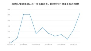 2022年12月,瑞虎8 PLUS鲲鹏e+销量为268辆,环比增长125.21%。2021年12月-2022年12月份,瑞虎8 PLUS鲲鹏e+销量为1414辆,