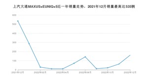 2022年12月,上汽大通MAXUS EUNIQ 5销量为161辆,同比下降69.91%,环比增长155.56%。2021年12月-2022年12月份,上汽大通MAXUS EUNIQ 5销量为1344辆,同比下降64.02%。