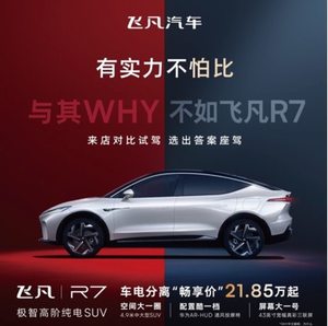 作为国内电动汽车品牌中的“黑马”,飞凡R7以较快的速度宣布了跟进。据悉,飞凡汽车推出了车电分离畅享价21.85万元起的亲民价格,还推出了2月28日之前购买飞凡R7即可享受价值2.1万元的限时购车礼遇。
