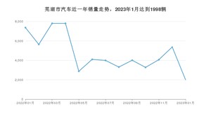 2023年1月,芜湖市汽车总销量为1998辆,同比下降72.89%,环比下降62.81%。2022年01月-2023年01月份,芜湖市总销量为61618辆,同比增长0.64%。在最近1年中,芜湖市销量在2022年03月达到最高,销量为7804辆。