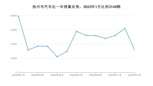 2023年1月,扬州市汽车总销量为3148辆,同比下降60.24%,环比下降49.39%。2022年01月-2023年01月份,扬州市总销量为59092辆,同比下降17.72%。在最近1年中,扬州市销量在2022年01月达到最高,销量为7917辆。