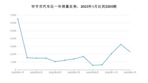 2023年1月,毕节市汽车总销量为2295辆,同比下降64.66%,环比下降29.43%。2022年01月-2023年01月份,毕节市总销量为25190辆,同比下降42.86%。在最近1年中,毕节市销量在2022年01月达到最高,销量为6494辆。