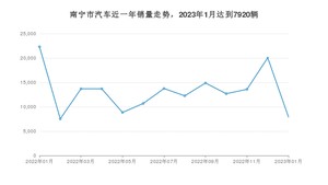 2023年1月,南宁市汽车总销量为7920辆,同比下降64.49%,环比下降60.52%。2022年01月-2023年01月份,南宁市总销量为171859辆,同比下降16.77%。在最近1年中,南宁市销量在2022年01月达到最高,销量为22302辆。