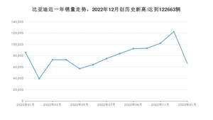 在国内市场上,比亚迪,在2023年1月的销量为66128辆,同比下降22.72%,环比下降46.09%。2022年01月-2023年01月份,比亚迪累计销量为1027114辆,较去年同期增长19.87%。